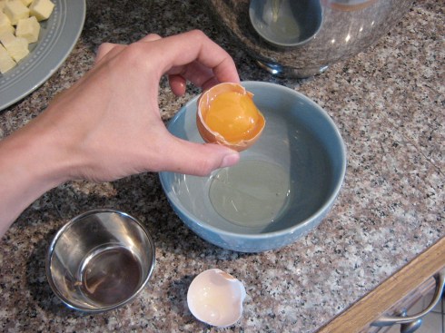 Separate the egg whites, one by one, into a small bowl before adding them to the mixer bowl – this way if any egg yolk (ie, fat – see above!) gets into one egg white, you won’t have ruined all of the whites.