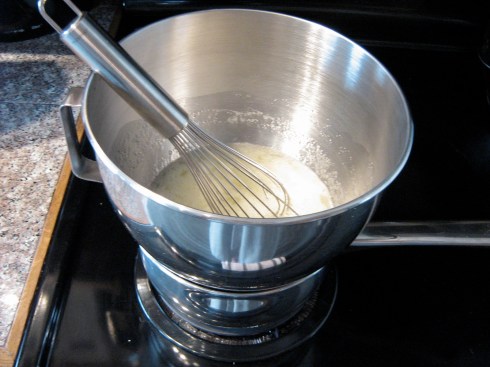 Place a small pot with about an inch of water on the stove over low heat. Place the mixer bowl with the egg whites in it on top of the pot to make a bain marie/double boiler. Make sure the water doesn’t touch the bottom of the bowl.