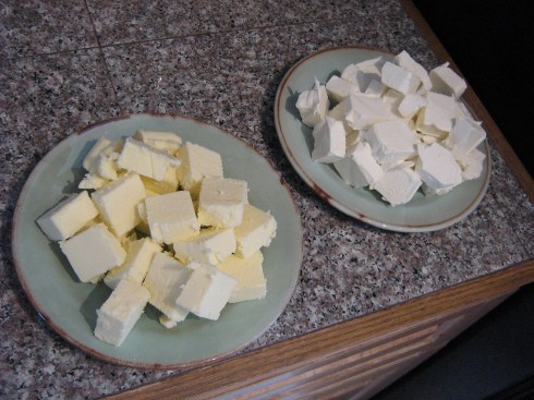 Remove your butter and cream cheese from the fridge and cut it into cubes of about 1-2 tbsp each (1 cup = 16 tbsp, to give you an idea of the size).