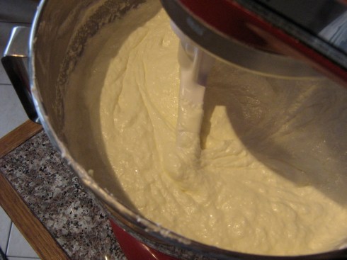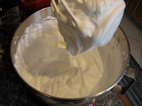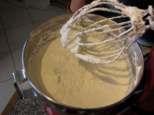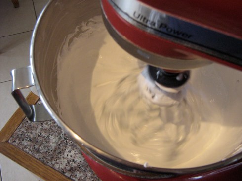 I scaled down the recipe to use only 1 egg white and got down to business. A full 3 hours of beating/whisking/stirring later, I still had soupy, curdled glop (albeit delicious, cheesecake-flavoured glop). I was reluctant to give up, because this recipe and all others I had read tell you to just keep beating it and not lose hope – it will eventually work out. But I had to go to bed, so I declared this small test batch a failure. I did not, however, lose faith in the recipe or the method: I figured that the amount was too small, that the beaters of the KitchenAid weren’t able to get into the mixture far enough to really do anything, that it was just too hot in the kitchen and the butter and cream cheese were melting. I made plans for a second test run with a slightly larger batch.