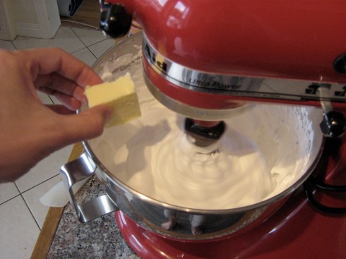 When the egg whites are completely cool, turn the speed to medium and start adding your butter, cube by cube.