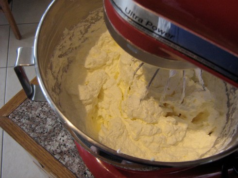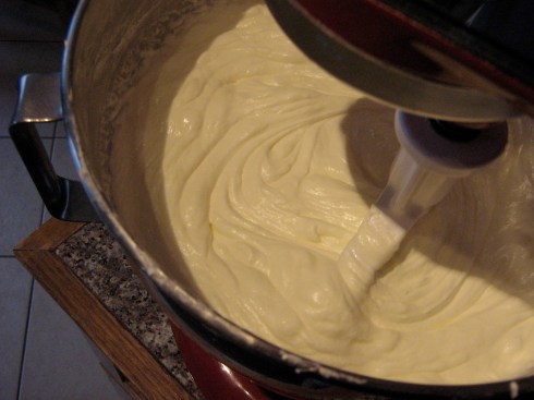 So, based on all I had learned, I made a larger batch (half of what I needed in total, to accommodate the size of my mixer), starting early in the morning to avoid the hot kitchen issue. You are supposed to let your butter/cream cheese come to room temperature, but I decided not to let either get too soft, thinking that the heat of the kitchen would be less of an issue that way. I whipped up the meringue, beat in the butter and cream cheese, and then set the mixer on high to do its thing. And two hours later, nothing. Still a curdled mess. I took the whisk attachment off the mixer and half-heartedly stirred at the frosting by hand a few times – and EUREKA! With slow stirring, the frosting somehow started to come together in a thick, fluffy mass. I put on the paddle attachment and turned the speed to low, and a (long) while later, I had proper frosting!! But seriously, it still took all bloody day. And I still had another batch to make.