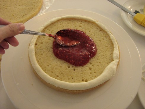 Place one cake layer on a cake board (I used foam core board) and pipe a line of frosting around the edge to keep the filling from leaking. Spread with a thin layer of raspberry jam.