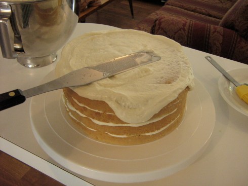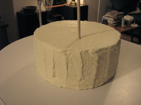 Frost the cake with a final, thicker layer of frosting. I made wide vertical stripes around the side of the cake using my offset spatula.