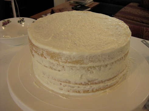 With an offset spatula, spread the entire cake with a thin layer of frosting (a crumb coat) to seal in the cake and prevent any crumbs from escaping, and refrigerate the cake to set the crumb coat (about 30 minutes).