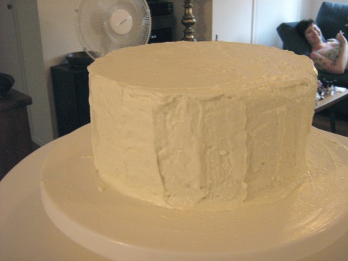 Pipe extra frosting around the base of each cake to hide the cake board. (Can you see how curdled the piped frosting is? Bah!)