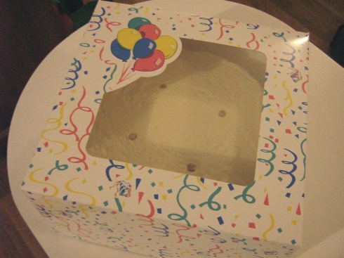 Put your cake in a box (free my local grocery store bakery) and marvel at how professional it looks in the bakery box!