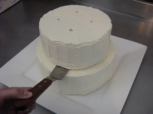 Insert wooden support dowels about 1.5″ from the edge of the cake, so they will be hidden by the tier stacked on top (I bought these 1/4″ dowels at Home Depot).