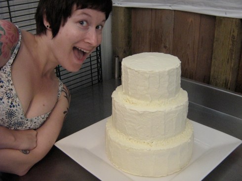 In the end, the cake as a whole turned out beautifully and it was delicious – and it didn’t melt or fall over or anything! I was hoping to get some pictures from the wedding photographer of the bride and groom cutting the cake (during which I had my fingers AND toes crossed and a horrible grimace on my face because I was terrified the whole thing would collapse!) but apparently the photos might be a while, so a) stay tuned! and b) I don’t have any pictures of what the inside looked like – but just know that this was a lemon cake with raspberry jam filling (a very easy, very delicious freezer jam – I used half a batch to fill the cake) and the-most-frustrating-but-nonetheless-delicious cream cheese Swiss meringue buttercream frosting, and everyone agreed that it tasted wonderful. 🙂
