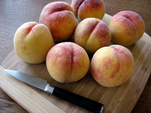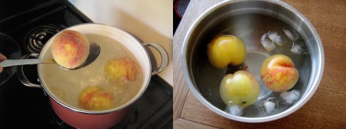Submerge the peaches in boiling water for about 30 seconds, then remove to a bowl of cool water for about 1 minute.