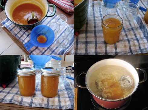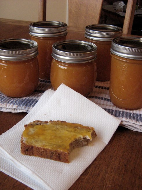 I’ve never actually canned anything on my own before, but I managed pretty well: I have a good collection of half pint jars (great for shaking up a quick salad dressing), I bought some canning lids and rings, and I used a large stock pot for the boiling water bath. I got a “home canning kit” as well, which included a jar funnel, rubberized jar tongs, and a handy magnetized lid picker-upper. I had to turn some of the jars on their side in the water bath because the stock pot wasn’t quite tall enough to cover them in water, but it didn’t seem to make any difference to the final product, which is DELICIOUS. Pure peach flavour, not too sweet… yum. Make this and eat it on toast – or better yet, banana bread ;).