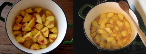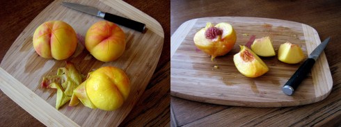 Peel off the skins – they should come off fairly easily. When your peaches are naked, pit them and cut into eight pieces (cut into quarters, then cut each quarter in half lengthwise).