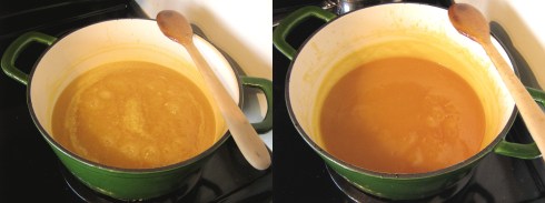 When the peach chunks can be easily squished with a wooden spoon against the side of the pot, remove the pot from the heat and purée the peaches with an immersion blender until very smooth. Add the sugar and lemon juice and stir. Return the pot to the heat and bring to a vigorous simmer. Let the peach purée bubble happily, stirring occasionally so nothing sticks on the bottom of the pot, until it is thick and deeply peach-coloured and the bubbles start to look syrupy. This could take anywhere from 30 minutes to an hour (or more).