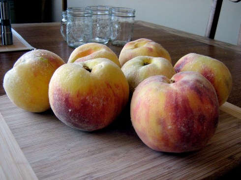 As soon as I saw the post for peach butter on smitten kitchen, I knew I was going to be making some (actually, I think that for most of the recipes she posts). My mum used to make peach butter when I was little and I could practically devour a whole jar in one sitting. So good. Okanagan peaches are in season here (88 cents a pound!) so I came home with 4 lbs the other day and got down to preserving.
