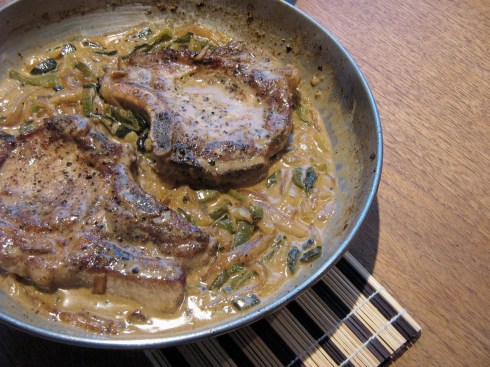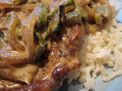 Making this is a little bit time consuming because you have to roast the peppers, but if you plan ahead you could roast the peppers while you brown the pork chops, then peel and chop them while the onion is sautéeing. If you’re the plan ahead type, that is. I usually seem to be cooking by the seat of my pants, so to speak.