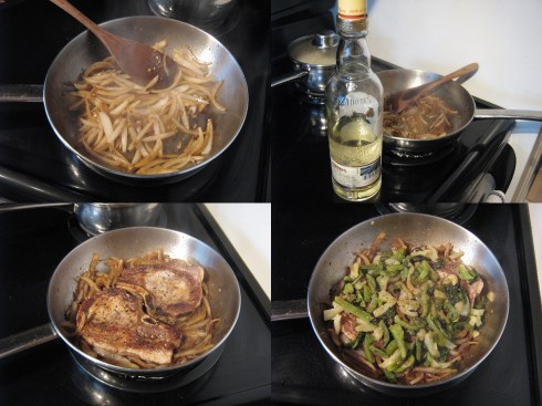 Deglaze the pan with a shot of tequila, stirring to scrape up the browned bits on the bottom of the pan. Nestle the pork chops back in the pan, cover with the roasted peppers, and sprinkle with more salt, pepper, and cumin.