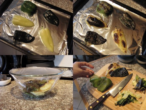 Place the peppers cut-side down on a foil lined baking sheet. Broil until the skin is charred, then put the peppers in a bowl and cover with plastic wrap. Let them steam for a few minutes, then remove the seeds and membranes, peel off the skins, and slice into strips. Set aside.