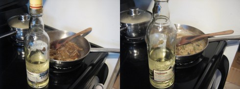 We have a recipe from Nate’s parents involving baked pork loin with green chili peppers and onions in a creamy sauce made with a little sour cream. With those ingredients you can’t really go wrong, but I still decided to play around with it a bit. I used bone-in pork chops (the bone adds more flavour and keeps them juicy) instead of pork loin, roasted peppers instead of canned jalapenos, and added some cumin. I also added tequila because – well, why not? I was feeling a slightly Mexican vibe from the peppers and cumin and it just seemed right. Turns out it was!