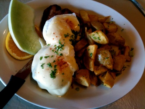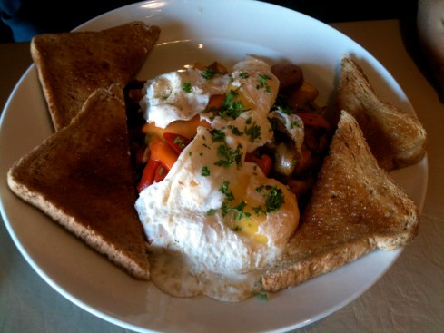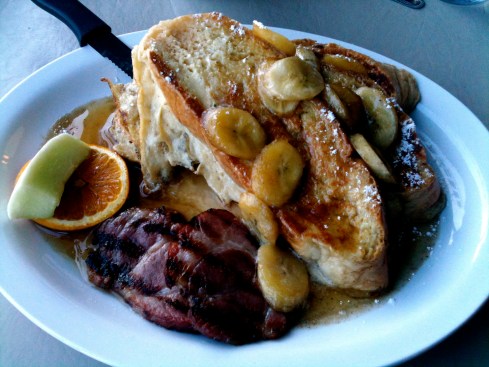 The portions are large, but not in that oh-my-god-I’m-going-to-die-if-I-eat-this kind of way – it’s not your average deep-fried, grease-laden, heavy diner breakfast. The ingredients are fresh, tasty, and very well-prepared. Their regular breakfast menu (they also have a lunch menu, but we’ve only ever been for breakfast) includes the traditional eggs with bacon/ham/sausage with hash browns and toast, as well as omeletes, skillets (corned beef hash, turkey sausage and bacon hash, veggie hash), french toast, and eggs bennies. They also have monthly and daily/weekly breakfast specials. The last time we were there, Nate and I both ordered the specials: Nate had a bacon cheddar burger benny, and I had the special french toast with bananas in rum caramel sauce. Both were insanely delicious (although I’ll admit I was in a bit of a carb-coma after!).