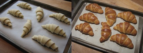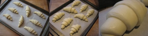 Place the rolled croissants onto a parchment paper-lined baking sheet, cover them lightly with plastic, and let them proof in a warm place for 3 hours (the longer the better), until quite puffy and jiggly and the layers of butter and dough are visible. Don’t let it get too warm or the butter will melt into the dough and all your careful folding and rolling efforts will be for naught!