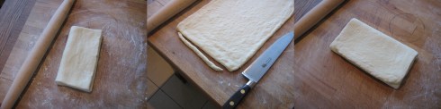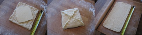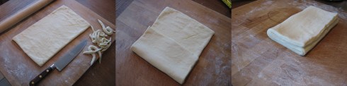 Remove the dough from the fridge and let it sit for a few minutes. Place it on a floured surface so that again the short edge faces you and the “open” long edge faces right. Repeat the rolling and folding (as above) twice more – these are turns three and four. Place the dough on a plate, cover with plastic, and place in the fridge for another 1-2 hours (or place something heavy on top of it and leave it in the fridge overnight).