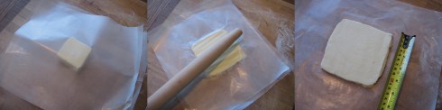 Place the butter between 2 sheets of waxed paper and tap/roll it with a rolling pin into a 5″ square. This will also soften the butter slightly – don’t let it get so soft that it gets melty at all. You want the butter and the dough to be about the same texture/consistency, so place the butter square in the fridge if necessary to firm it up.