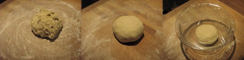Turn out onto a lightly floured surface and “knead” the dough 10-12 times – as illustrated in the Julia Child video, essentially pick up the dough and throw it down, rather than folding and pressing it with your hands. The dough should be quite soft and silky-feeling – you want to hit a balance with the “kneading” between just enough gluten development and not too much. Gather the dough into a ball, put it in a bowl, and cover it with plastic. Let it rise for about 3 hours (or overnight in the fridge) until tripled in size.