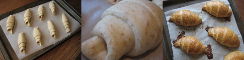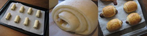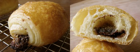Roll out the croissant dough as above, but form each half into an 8″ x 12″ rectangle instead of a 10″ square. Cut each rectangle lengthwise into four strips. Spread about 1 tsp of hazelnut cream over the bottom inch of each rectangle and top with about 1 tsp of chopped chocolate. Roll up the dough to seal in the filling and place on a parchment paper-lined baking sheet.