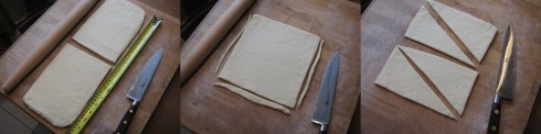 Take the dough out of the fridge and let it sit for a few minutes. On a floured surface, roll it out into a 5″x18″-ish rectangle, then cut it in half into two squares(ish). Place one square back in the fridge. Roll the other out into a 10″ square. Trim the edges so you can see the butter layers. Cut the square into two rectangles, then each rectangle into two triangles.