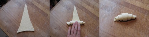 Stretch each triangle into more of an isosceles triangle (long sides of equal length) and roll up, starting from the wide end and finishing with the pointed tip tucked underneath. Your finished croissant should have 7 little rolled “steps”. If you want the croissant to be more curved in a crescent shape, make a small notch in the wide base of the triangle and direct the first roll out towards each side.
