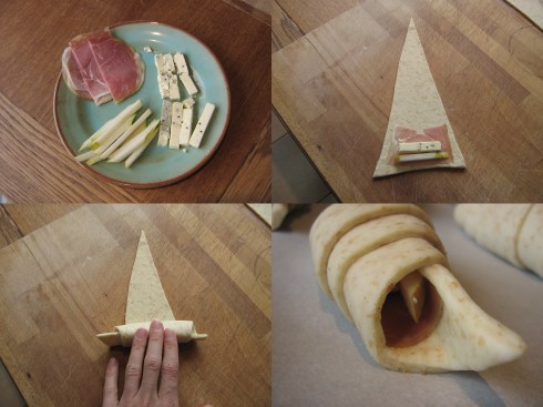 Roll and cut the croissant dough into triangles as above. At the wide end of each triangle, place a thin slice of prosciutto and top with a sliver of pear and a sliver of blue cheese (or about 1 tsp crumbled). Roll up the dough to seal in the filling and place on a parchment paper-lined baking sheet.