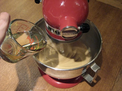 With the mixer on low, slowly pour in a thin stream down the side of the bowl: