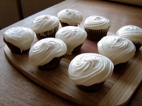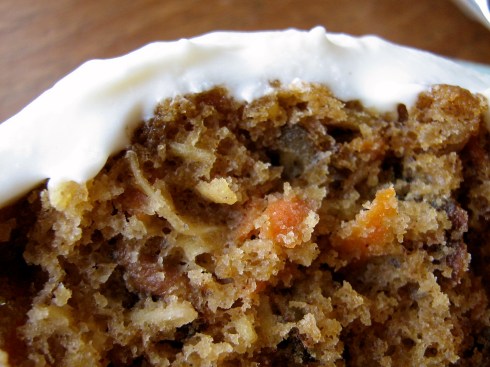 I must have bad cream cheese frosting mojo, because after this round the score is cream cheese frosting: 2, Korena: 0. (And I swear this was a completely different recipe and method than that damn wedding cake frosting!). Nonetheless, the cupcakes were (messily) enjoyed, and this is definitely a carrot cake to try. I am including the original cream cheese white chocolate icing because I know that it actually turns out. If you are brave, try the maple cream cheese frosting – maybe yours will work out better than mine did!