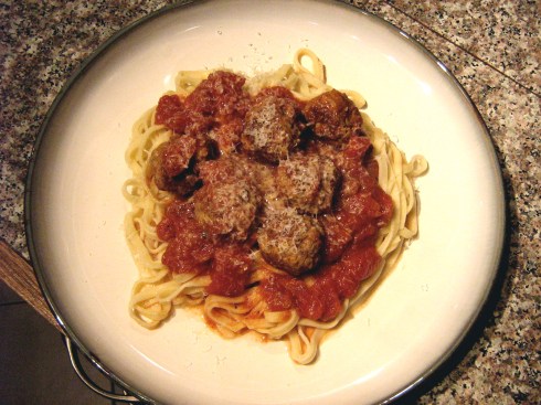 Stir, cover, bring to a simmer, then reduce the heat to medium-low and continue simmering for about 20 minutes. Remove the lid and check the seasoning of the tomato sauce – the meatballs should have given it some flavour, but it will probably need salt and pepper. Continue to simmer, uncovered, until the sauce reaches the desired thickness. Serve over cooked, long pasta (spaghetti or linguini or whatever) with lots of parmesan cheese. Serves 2-3.