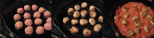 Heat 1 tbsp olive oil in a heavy skillet over medium heat. Add the remaining 15-or-so meatballs to the pan and brown them on all sides, either by turning them with tongs or by giving the pan a violent shake to dislodge them from the bottom of the pan. When they are thoroughly browned, add: