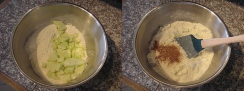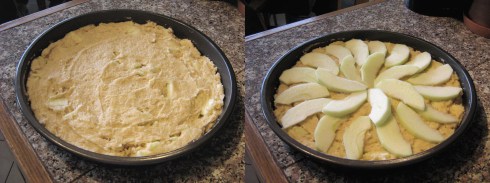 Spread the batter into a 9″ greased cake pan, lined with parchment paper. Arrange 1 peeled and sliced apple over the top.