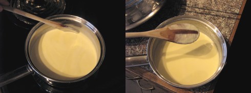 Pour everything back into the pot and heat over medium-low heat, stirring constantly in a figure-8 motion, until the mixture thickens enough to coat the back of a spoon (ie, you can drag you finger through it and it leaves a clean trail without the sides running into it). Don’t let it boil!