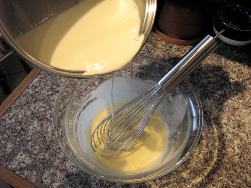 When the cream/milk is scalded (ie, almost-but-not-quite boiling), whisk a very small amount into the egg yolk mixture to temper it (ie, so it doesn’t make scrambled eggs), then slowly add the rest of the milk/cream mixture, whisking constantly.