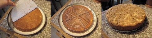 Allow to cool in the pan for a few minutes, then invert the cake onto a plate, remove the pan and parchment paper, and revert (re-invert? un-invert?) onto a cooling rack.