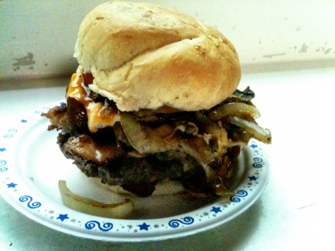 Nate and I split an order of the Boe Special (poutine with fried onions) and each had a La Belle Burger – a double patty, double cheese, double bacon monster loaded with fried onions and mushrooms and smothered in La Belle sauce. Oh, and a slice of tomato. When I ordered my burger, the guy behind the counter gave me an approving look and said I was a “brave lady”. Heh.