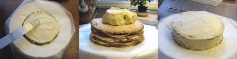 Place a dacquoise disc on a cake plate, protected with waxed paper. Spread with a thin layer of frosting. Repeat with remaining dacquoise layers, then frost the top and sides of the cake.