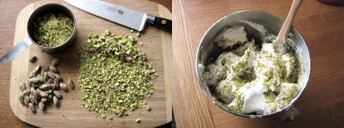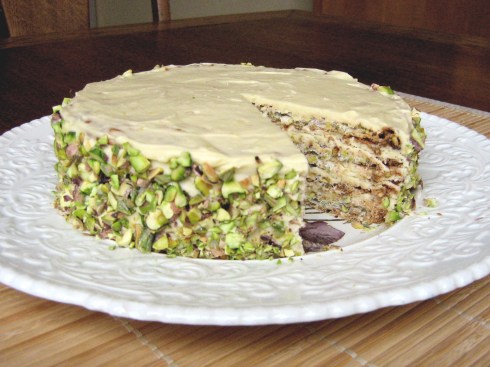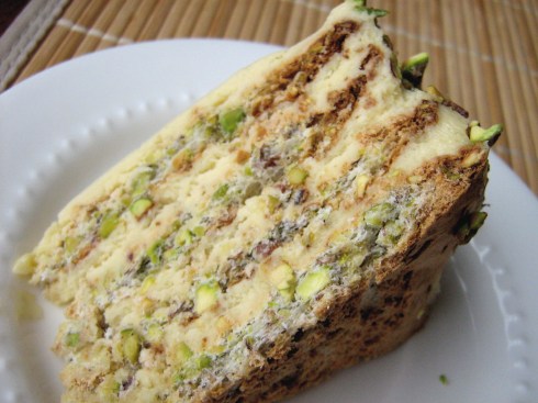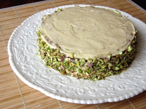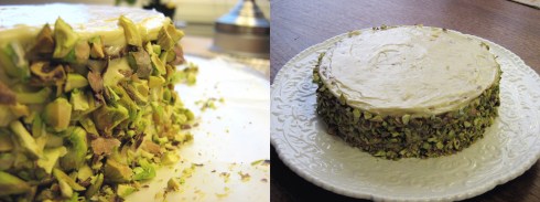 Press about 3/4 cup roughly chopped pistachios onto the sides of the cake.