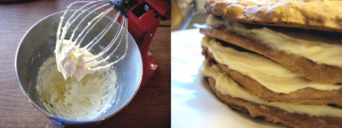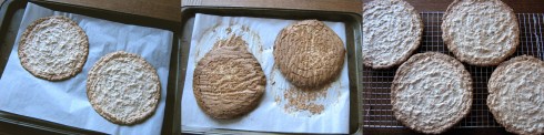 Bake the dacquoises in the 325˚ oven for 30 minutes, rotating half-way through, until golden brown and crispy. Turn off the oven, crack open the door, and leave the dacquoises in there for 30 more minutes. When the time is up, carefully peel the dacquoises off the parchment paper, flip them over, and return them to the cooling oven for another 30 minutes. Remove them from the oven to a rack to cool completely.