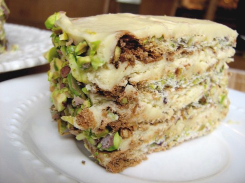 Refrigerate for at least 3 hours before serving. Cut into slices with a serrated knife. The longer you let the cake sit (up to 5 days, covered, in the fridge), the less crunchy/more chewy the layers will become. Leftovers can be wrapped in plastic and frozen.