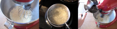 Bring to a boil and cook to 235˚F. Remove from the heat. With the mixer still on high, carefully pour the hot syrup in a thin stream into the egg yolks. Try to avoid pouring the syrup over the beater, as it will spatter the syrup all over the sides of the bowl where it will harden, rather than mixing into the egg yolks.