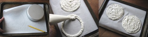 Line 2 baking trays with parchment paper and trace two 6″ circles on each. Turn the paper over so the pen or pencil markings are facing down and very lightly grease the paper (I forgot to do this). Fill a pastry bag with the pistachio-meringue mixture and using the circle outlines as a guide, pipe four 6″ disks on the parchment paper. Try to make them as even and flat as possible.