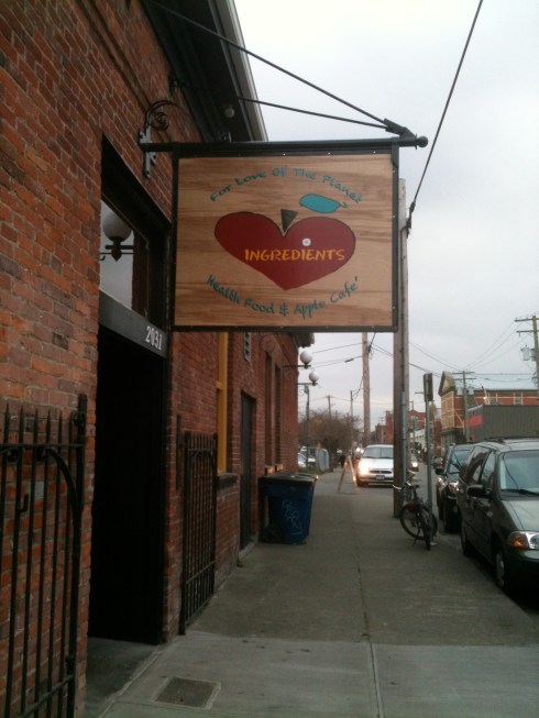 So imagine my delight when I came across a brand new (2 weeks old!) health food store down by Capital Iron, called Ingredients Health Food Store & Apple Café. Despite the store’s newness, the staff were very knowledgeable about their products, and incredibly friendly on top of that. I spent a good thirty minutes in the store, perusing the grocery aisle (organic, gluten-free, vegan, sprouted grain, unprocessed, naturally sweetened products), cooler aisle (various soy and tofu products, nut butters and milks and more), produce section (organic/local) and bulk section (extensively gluten-free and very well priced). The bulk section was the most impressive: they had all the expected grains, dried beans, pulses, and fruit, as well as a ton of dried herbs, loose teas, coffee beans, and about four varieties of TCHO chocolate pieces (which I will definitely be back to purchase for the upcoming orgy of Christmas baking that will be taking place in my kitchen over the next few weeks). The store encourages people to bring in their own bulk containers to fill up right in the store, and they sell mason jars and other containers at cost to encourage people to use them instead of disposable bags.