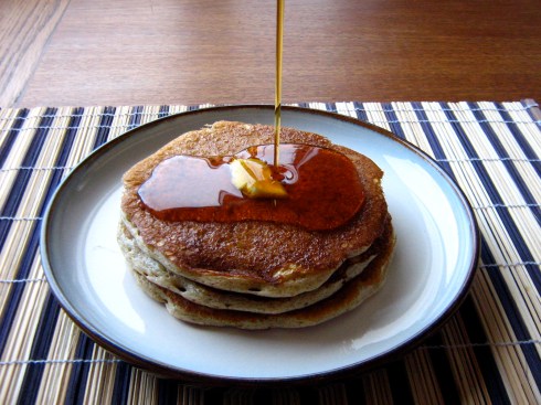 These pancakes are very absorbent little sponges, so to give them something in addition to maple syrup to soak up without becoming sickly sweet, I made a quick strawberry-orange sauce: about 1 cup of frozen strawberries cooked with the juice of 2 mandarin oranges, a dash of water, and a few tablespoons of sugar. I boiled it until it thickened slightly, then pureed it in the blender and served it warm with the pancakes and maple syrup.
