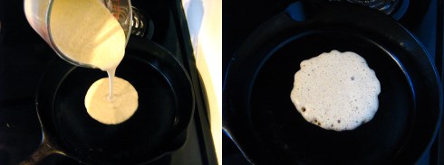 Grease the heated skillet with a bit of vegetable oil on a paper towel, then pour about 1/4 – 1/3 cup of the batter into the pan. The batter will spread out a bit, so I like to cook just one pancake at a time. The surface of the pancake will be covered in irregular-sized bubbles.