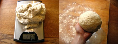 First of all, stir yourself up a batch of no-knead crusty artisan bread dough and let it sit overnight or longer in the fridge to develop some sourdough-ish flavour. When you are ready to bake, cut off a 1 – 1 1/3 lb piece of dough (I used 1 1/3-ish lbs), sprinkle it gently with flour, and form it into a ball with your hands by pulling down the top and sides and pinching them underneath. This should only take a few seconds.